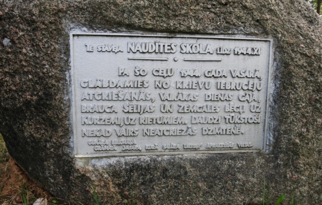 Memorial stone is dedicated to Naudīte School what was burned down in 1944.