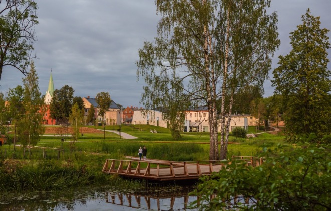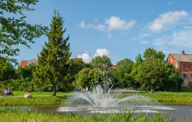 The well-maintained left bank of Bērze river, on which the Dobele Music School and the Concert Hall “Zinta” are situated, has become a popular place among both the local residents and guests who choose it for walking and recreational activities. The platform on the riverbank reveals the fountains arranged in the centre of the river and the complex of Dobele Castle ruins. The scenic walking route is highlighted by a fountain designed in the shape of a peculiar aquatic plant – the water - plantain.