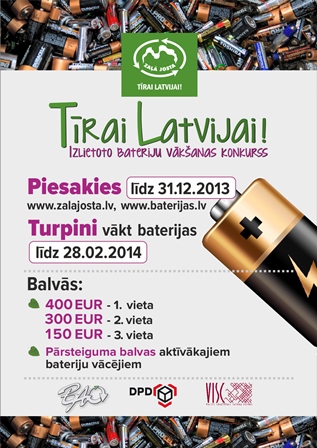 Izlietoto bateriju vākšanas konkursu „Tīrai Latvijai!" rīko „Zaļā josta" sadarbībā ar AS „BAO" un Valsts izglītības satura centru. Konkursa mērķis ir veicināt bērnu un jauniešu izpratni par izlietoto bateriju kaitīgo ietekmi uz vidi un rosināt bērnus caur praktisku darbību ikdienā samazināt apkārtējās vides piesārņojumu ar videi bīstamiem atkritumiem.