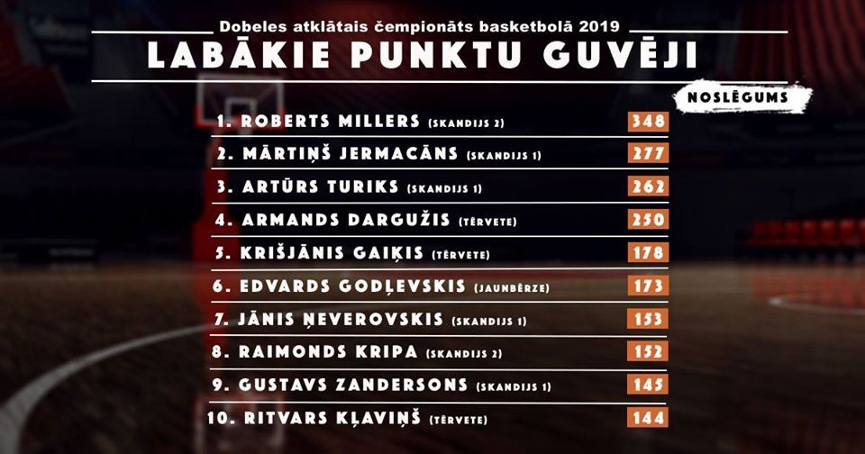 (Gustavs Zandersons, Artūrs Turiks, Mārtiņš Jermacāns, Jānis Grands, Edvards Miķelsons, Gatis Kobzars, Miķelis Reinfelds, Valters Seņko, Jānis Neverovskis, Jānis Mucenieks, Kristaps Āriņš, Edgars Aleksejevs) aiz sevis atstājot pagājušā gada uzvarētāju Tērvetes novada basketbola komandu.