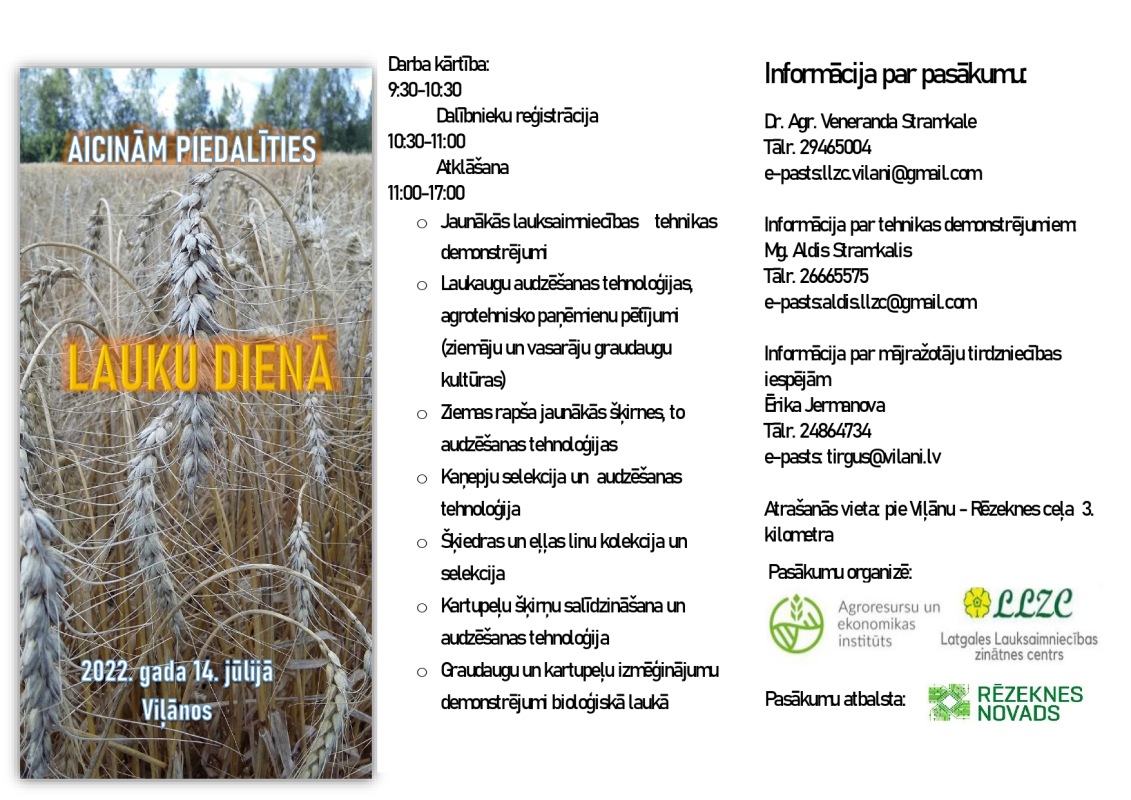 14. jūlijā, Agroresursu un ekonomikas institūts un Latgales lauksaimniecības zinātnes centrs (LLZC) sadarbībā ar Rēzeknes novada pašvaldību organizē ikgadējo Lauku dienu, uz kuru aicina visus lauku uzņēmējus un zemniekus, kuri vēlas saņemt nozīmīgu informāciju savu saimniecību attīstībai. Lauku dienas norises vieta: LLZC demonstrējuma lauki pie autoceļa A12 (Jēkabpils – Rēzekne – Ludza – Krievijas robeža (Terehova)), ceļa posmā aptuveni 3 km no Viļāniem virzienā uz Rēzekni.