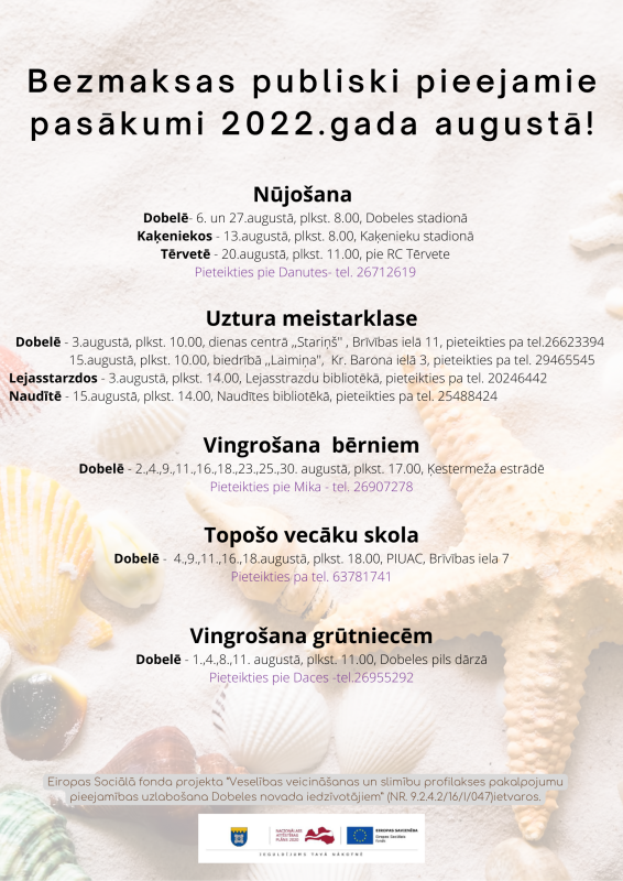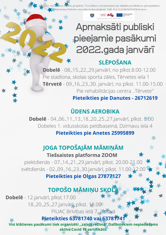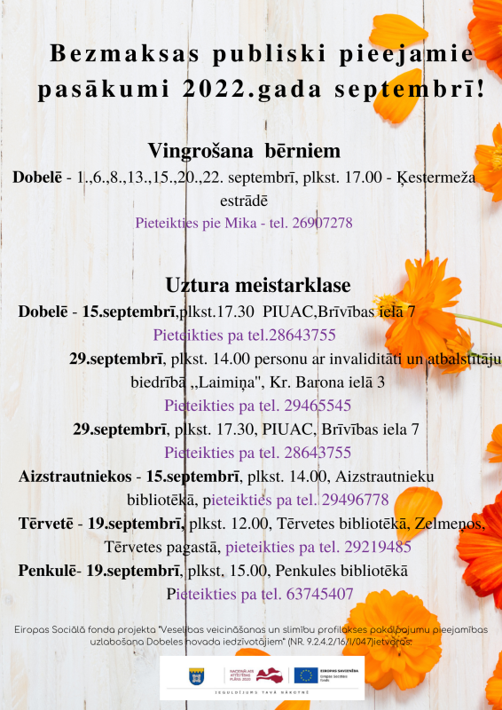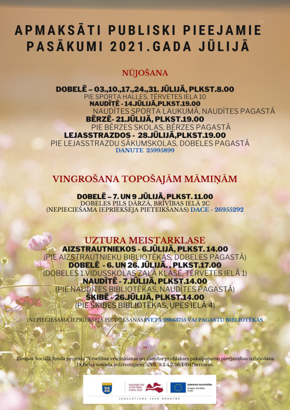 Tuvākajā laikā paredzēts organizēt šādas bezmaksas aktivitātes Dobeles novada iedzīvotājiem: