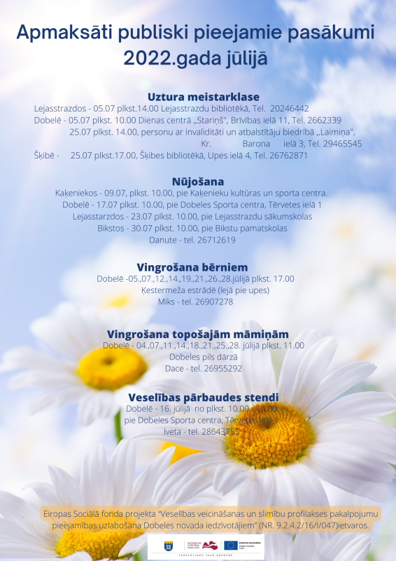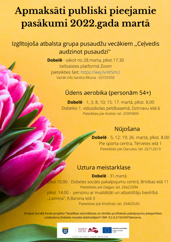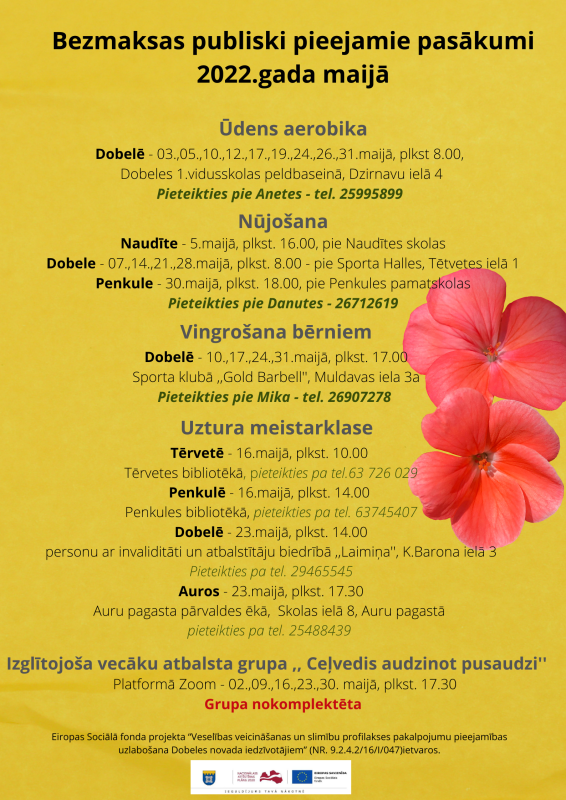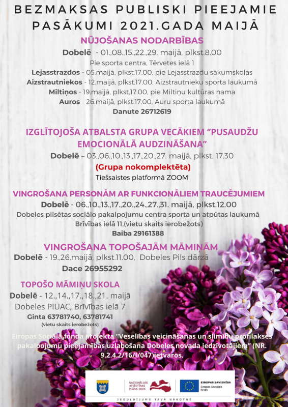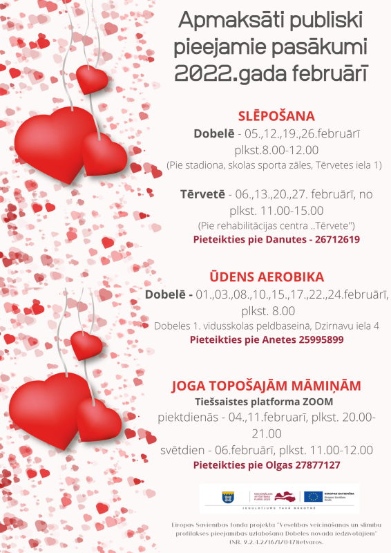 Aktivitātes iedzīvotājiem ir bezmaksas. Tām var sekot līdz projekta Facebook vietnē – Veselīgi Dobeles novadā, kā arī dobele.lv mājaslapā.